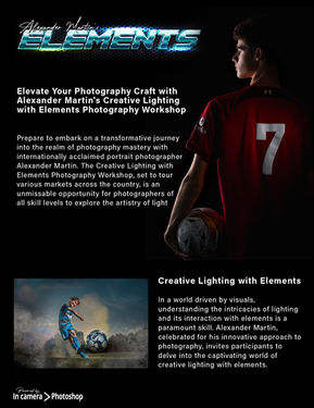 Alexander Martin will be presenting a complete presentation of his Elements Workshop using creative lighting, gels, and different elements to create cinematic and emotion filled images.
